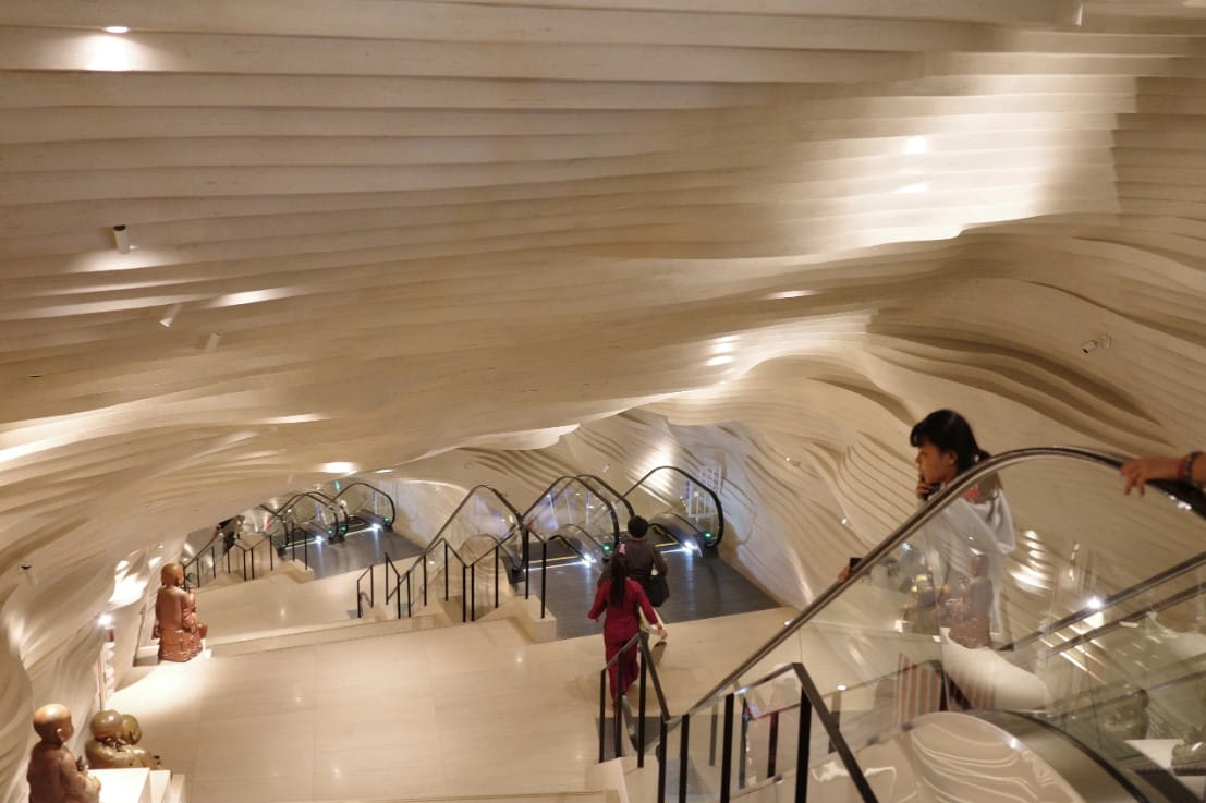 Không ít người lần đầu bước xuống khu vực đường hầm đều bất ngờ khi phát hiện một không gian rộng lớn với tường đá uốn lượn như sóng, hệ thống thang cuốn và các lối đi nối dài sâu vào bên trong. Cảm giác giống như đang bước vào một hang động được điêu khắc công phu, tạo nên trải nghiệm rất khác so với các công trình tâm linh truyền thống.
