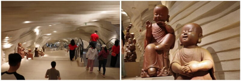 Dãy tượng chú tiểu với nhiều dáng vẻ sinh động được bố trí dọc lối đi trong đường hầm, mang ý nghĩa biểu trưng cho sự hồn nhiên, hoan hỉ trong Phật giáo