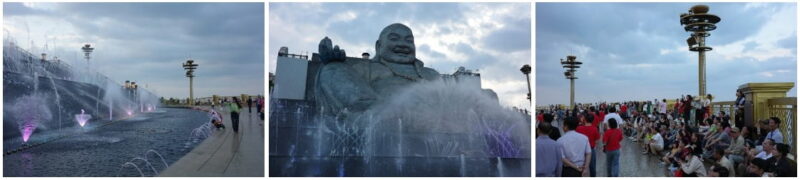 Một trải nghiệm khác cũng thu hút đông đảo du khách tại khu vực tượng Di Lặc là chương trình nhạc nước được trình diễn ngay phía trước tượng. Mỗi buổi diễn kéo dài khoảng 5 phút, 15 phút một lần, tạo nên những màn kết hợp giữa ánh sáng, âm nhạc và các cột nước cao hàng chục mét.