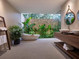 Phòng tắm riêng với vòi sen hoặc bồn tắm, cửa sổ lớn nhìn ra vườn hoặc hồ bơi.