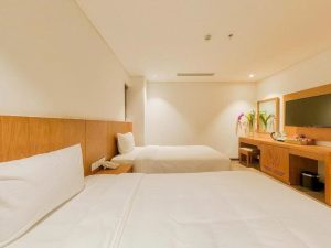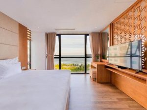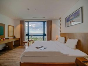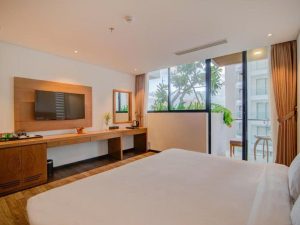 Phòng nghỉ sang trọng, trang bị đầy đủ tiện nghi (tivi, minibar, máy sấy, trà/café miễn phí).